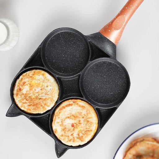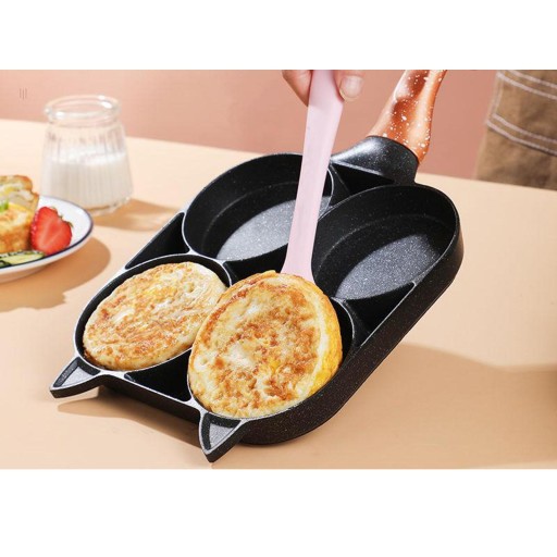 Patelnia wykonana z aluminium i silikonu, bezpieczna i trwała, pozwala na smażenie czterech jajek jednocześnie, co jest bardzo wygodne do zrobienia śniadania