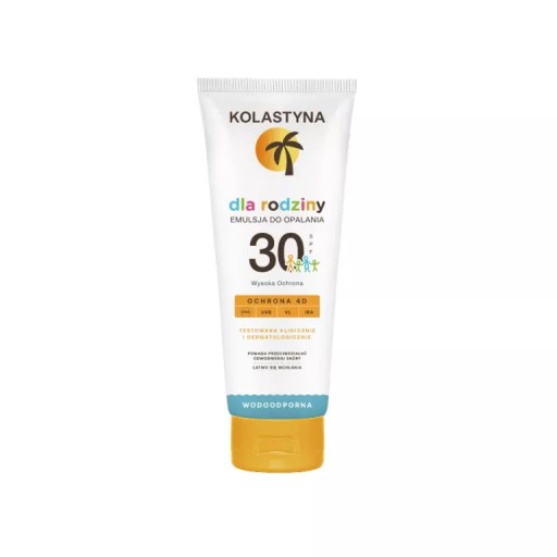 Emulsja do opalania dla rodziny SPF 30 marki Kolastyna stworzona została do pielęgnacji skóry dzieci powyżej 3 roku życia i dorosłych. W skuteczny sposób chroni przed czterema głównymi rodzajami promieniowania (UVA, UVB, VL, IRA) odpowiedzialnymi za uszkodzenie skóry. Pomaga zminimalizować prawdopodobieństwo wystąpienia reakcji alergicznych i przeciwdziała odwodnieniu naskórka.