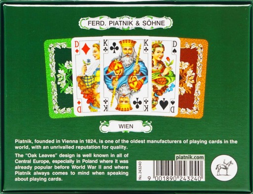 Dwutaliowy komplet wyprodukowany przez wiedeńską fabrykę specjalnie z myślą o polskich wielbicielach tego przedwojennego wzoru, dostępnego dotychczas tylko w wersji pojedynczych talii. Są to jedne z najbardziej rozpoznawalnych Piatnikowskich kart, lubiane już przez Piłsudskiego. W dzisiejszych czasach bywają znane jako "Pewexy", od nazwy sklepów, w których gracze mogli zdobyć ten deficytowy za czasów PRL towar. Na awersach piękne figury, na rewersach i opakowaniu charakterystyczne liście dębu. Talie składają się z 55 plastikowanych kart o wymiarach 58 x 89 mm i gramaturze 310. Idealne zarówno do brydża, pokera, remika jak i innych gier.