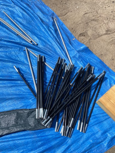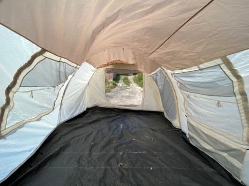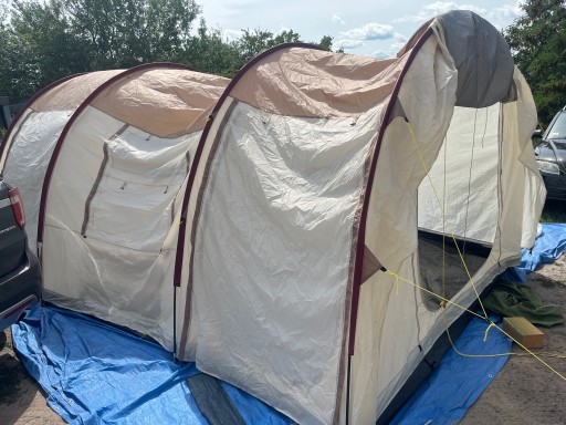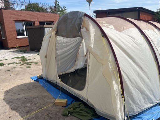 Podłoga namiotu posiada rozcięcia, niektóre dziurki są pozaklejane szarą taśmą. Zabezpieczenia szwów miejscami są rozklejone.