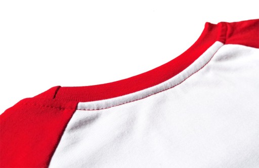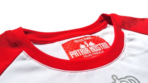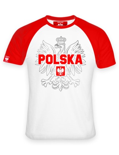 Koszulka wykonana jest w kroju raglan, z kontrastujących ze sobą dzianin w naszych barwach narodowych. Rękawki i kołnierzyk to kolor czerwony, natomiast korpus jest biały. Prezentowany wzór to idealna propozycja dla każdego kto kocha Polskę i chce zaakcentować swoje przywiązanie do swojego kraju. Duma, jaką wyrażają narodowe barwy i symbole, a zarazem prostota i bezpośredni przekaz, nadają im niepowtarzalnego charakteru.