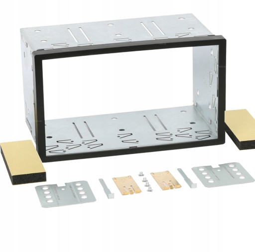 Montaż ten nie jest prosty. Metalową kieszeń montujemy w plastikowej ramce dopasowanej wymiarami do dziury po fabrycznym radiu. Po zamontowaniu metalowej kieszeni wsuwamy do niej radio. Na końcu montujemy plastikową obramówkę, co uzupełni szczelinę pomiędzy panelem radia a ramką.