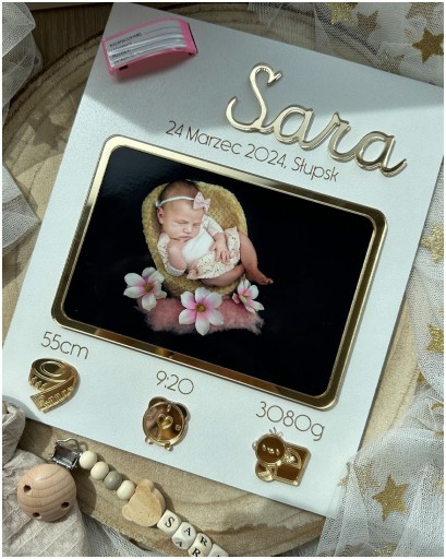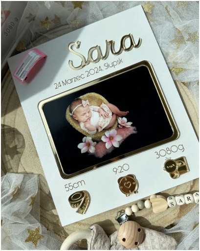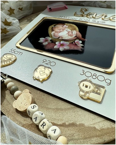 Wyjątkowa personalizowana ramka wykonana z materiału drewnianego oraz lustrzanych złotych elementów. Na zewnętrznej stronie ramki znajduje się miejsce na włożenie opaski identyfikacyjnej, którą dziecko otrzymuje w szpitalu podczas narodzin. Dodatkowymi elementami są: złote imię, złota ramka na zdjęcie dziecka oraz złote symbole wzrostu, godziny urodzenia oraz wagi.