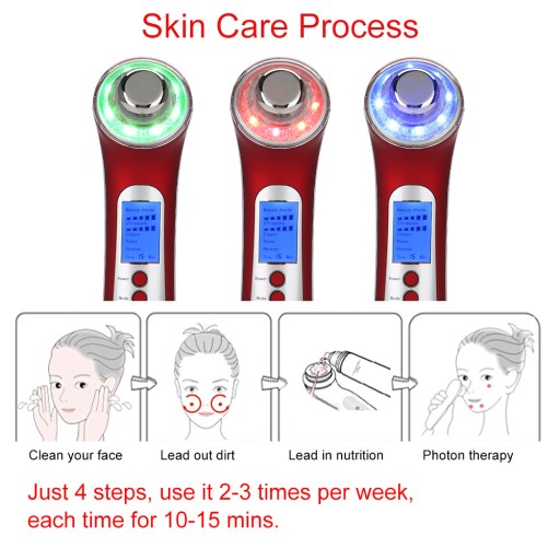 5. Terapia fotonowa: czerwona dioda LED skupia się na działaniu przeciwzmarszczkowym, wzmacnia kolagen skóry; Niebieska dioda LED koncentruje się na leczeniu trądziku, zabija bakterie; Zielona dioda LED skupia się na równowadze i spokoju skóry