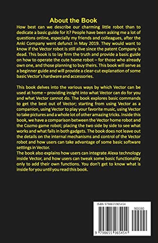 DO YOU WANT TO PUSH YOUR ANKI VECTOR AND COZMO ROBOTS TO IT’S WIT END? THEN THIS BOOK IS FOR YOU. How best can we describe our charming little robot than to dedicate a basic guide for it? People have been asking me a lot of questions online, especially my friends and colleagues, after the Anki Company went defunct in May 2019. They would want to know if the Vector robot is still alive since the patent Company is dead. This book is to lay firm the truth and provide a basic guide on how to operate the cute home robot – for those who already own one, and those planning to buy theirs. This book will serve as a beginner guide and will provide a clear-cut explanation of some basic Vector’s hardware and accessories. This book delves into the various ways by which Vector can be used at home – providing insight into what Vector can do for you and what Vector cannot do. The book explores basic commands to get the best out of Vector; starting from using Vector as a companion, using Vector to play your favorite music, using Vector to take pictures and a whole lot of other amazing tricks. Inside this book, we have a comparison between the Vector home robot and the Cozmo game robot; placing the two side by side to see what works and what fails in both gadgets. The book does not leave out the details on the internal mechanisms and control of the Vector robot and how users can take advantage of some basic software settings in Vector. The book also explains how users can integrate Alexa technology inside Vector, and how users can tweak some basic functionality only to add their own functions. You don’t get to know what is inside for you until you read this book. Don’t wait anymore, scroll up and click the BUY NOW button to push your Anki Vector Robot to its wit end.