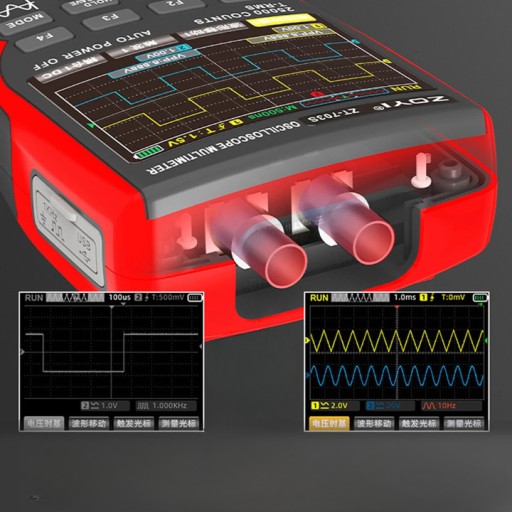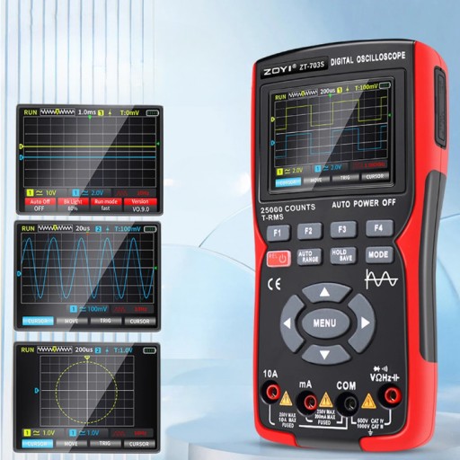 Dzięki konstrukcji 3 w 1 produkt ten w genialny sposób integruje funkcje oscyloskopu cyfrowego, multimetru i źródła sygnału w jednym urządzeniu. Wyposażony w kolorowy wyświetlacz o przekątnej 3,5 cala. Wielofunkcyjna konstrukcja, z napięciem AC, napięciem DC, prądem AC, prądem DC, rezystancją i funkcją testu pojemności. Funkcja oscyloskopu dwukanałowego o szerokości pasma 50 MHz i częstotliwości próbkowania 280 MS. Wbudowany generator sygnału przebiegu z funkcją automatycznego pomiaru i rozpoznawania przebiegu, nie ma potrzeby wyraźnego wyświetlania zmierzonego przebiegu sygnału bez zmierzonego przebiegu sygnału.