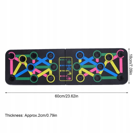 3. Deski do pompek, oznaczone różnymi kolorami dla określonych grup mięśni, zapewniają różnorodne pozycje i kąty ćwiczeń.