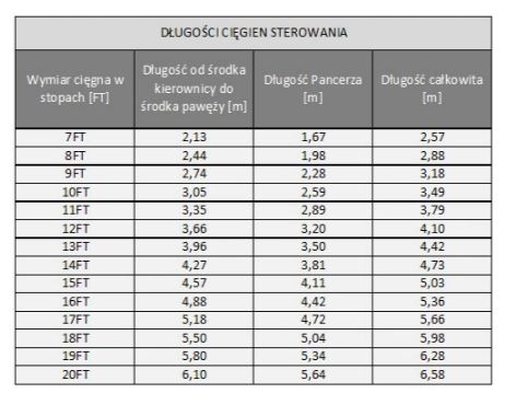 Jeżeli dokonujemy wymiany starego sterociągu, należy odnaleźć na jego pancerzu nadrukowaną długość wyrażaną w stopach (FT). W przypadku nowej instalacji sumujemy długość A+B+C na załączonym rysunku. (Od środka przekładni do środka pawęży) Otrzymaną liczbę dzielimy przez 30,5cm, wynik zaokrąglamy w górę do odpowiedniej długości cięgna w stopach FT.