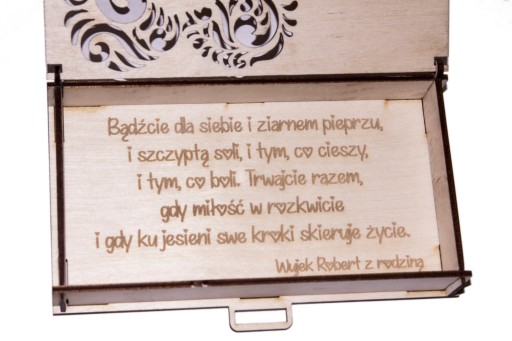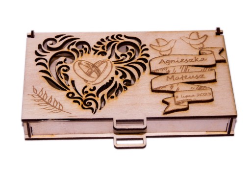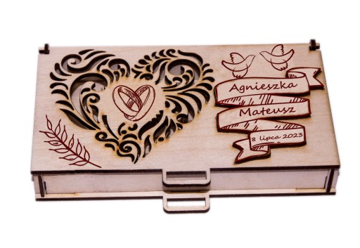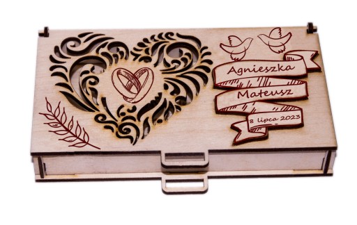 Chcesz wyróżnić się? Chcesz zaintonować młodym? Podaruj im pieniądze w spersonalizowanym pudełku. Idealny prezent od rodziny, chrzestnych, znajomych a nawet od Ciebie. Piękne pudełko na pieniądze wykonane z wysokiej jakości sklejki drewnianej, idealne dla pary młodej w dniu ich wspaniałego ślubu i niezapomnianego wesela. To eleganckie opakowanie będzie doskonałym miejscem do przechowywania hojnych darów pieniężnych, które otrzymają od swoich gości. Pan młody i Pani młoda będą zachwyceni tym unikalnym dodatkiem, który podkreśli ich szczególny dzień. Pudełko na pieniądze z pewnością doda blasku i magii ich romantycznemu przyjęciu, zapewniając bezpieczne miejsce dla wszystkich składanych przez gości hojnych życzeń w postaci gotówki. To wyjątkowe pudełko na pieniądze z pewnością stanie się niezastąpionym elementem dekoracji weselnej i doskonale uzupełni całą atmosferę tego niepowtarzalnego wydarzenia.