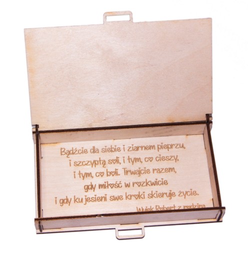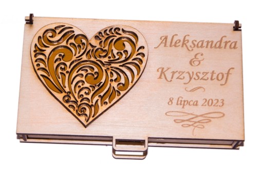 Idealny prezent od rodziny, chrzestnych, znajomych a nawet od Ciebie. Piękne pudełko na pieniądze wykonane z wysokiej jakości sklejki drewnianej, idealne dla pary młodej w dniu ich wspaniałego ślubu i niezapomnianego wesela. To eleganckie opakowanie będzie doskonałym miejscem do przechowywania hojnych darów pieniężnych, które otrzymają od swoich gości. Pan młody i Pani młoda będą zachwyceni tym unikalnym dodatkiem, który podkreśli ich szczególny dzień. Pudełko na pieniądze z pewnością doda blasku i magii ich romantycznemu przyjęciu, zapewniając bezpieczne miejsce dla wszystkich składanych przez gości hojnych życzeń w postaci gotówki. To wyjątkowe pudełko na pieniądze z pewnością stanie się niezastąpionym elementem dekoracji weselnej i doskonale uzupełni całą atmosferę tego niepowtarzalnego wydarzenia.