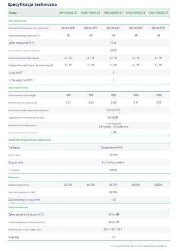 Oferowany falownik jest firmy Hoymiles, jeden z największych producentów mikroinwerterów do instalacji fotowoltaicznych, przedstawia 2-kanałowy mikroinwerter łączony w układzie łańcuchowym, charakteryzujący się wyjątkowo szerokim zakresem napięcia wejściowego prądu stałego (16-60 V) i niskim napięciem rozruchowym (tylko 22 V). Dzięki wydajności konwersji do 96,7% i wydajności MPPT do 99,9%, mikroinwerter Hoymiles należy do światowej czołówki.