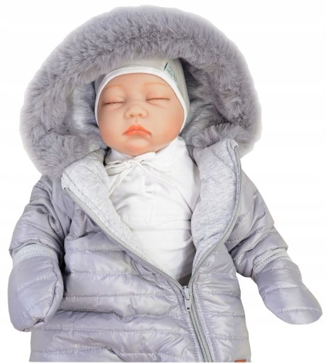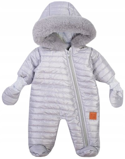 Krój: kombinezon, zasuwany po skosie na zamek, przy szyi zabezpieczony materiałem aby nie drażnić skóry dziecka, w rękawkach ściągacze i odpinane rękawiczki.