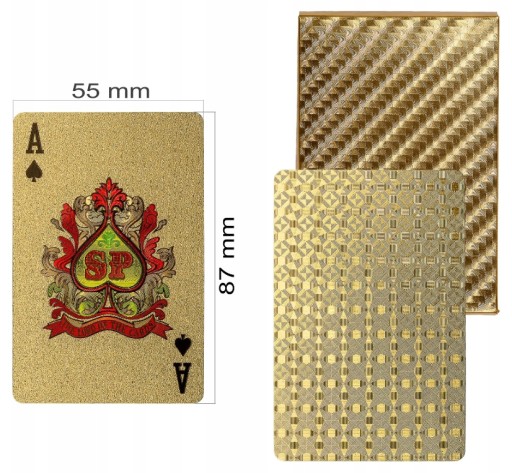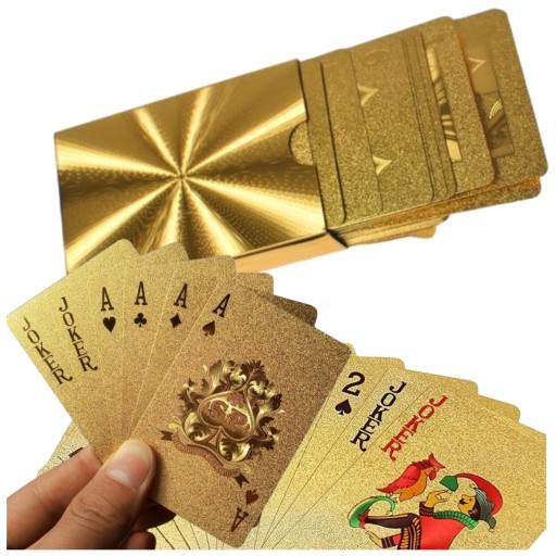- Wysokiej jakości plastikowa talia kart w kolorze złotym.