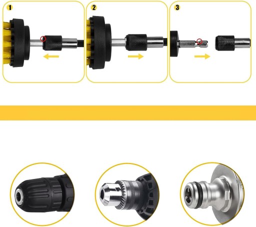 - Są kompatybilne z prawie wszystkimi bezprzewodowymi nasadkami szczotek szorujących z sześciokątnym gniazdem 1/4 cala. Wystarczy włożyć nasadkę szczotkową do wiertarki i dokręcić ją.