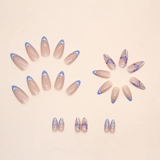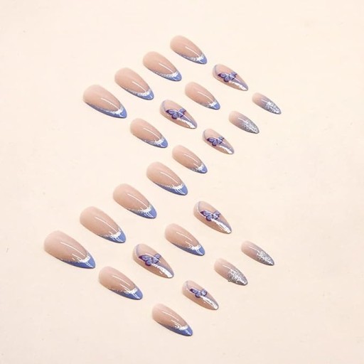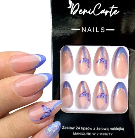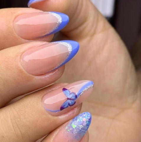 ✔️ Tipsy gotowe, paznokcie almond. Naklejane sztuczne paznokcie zdobione. Stylizacja z kolorowym, niebieskim, brokatowym, srebrnym french'em ze zdobieniem w kształcie motyla. Doklejane paznokcie błyszczące. Tipsy delikatny french. Srebrne paznokcie. Paznokcie swirl.