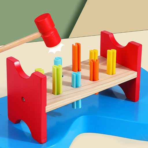Walenie zabawki: Użyj zabawkowego młotka, aby wbić kołki. Wbij te drewniane kołki w otwory, aby stworzyć stół warsztatowy. Odwróć cały stół warsztatowy i zacznij od nowa.