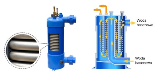 Wymiennik płaszczowo-rurowy jest zarazem skraplaczem pompy ciepła, który zapewnia wysoką efektywność przekazywania ciepła. Woda basenowa znajduje się w części płaszczowej o niskich oporach przepływu, a czynnik chłodniczy przepływa przez wężownicę o rozwiniętej powierzchni oddawania ciepła. Wężownica jest wzmacniana uchwytami dla ochrony przed drganiami i turbulencjami przepływającej wody basenowej. Odporność wymiennika na chemiczne oddziaływanie wody basenowej zapewniają zastosowane w budowie wymiennika materiały - stal tytanowa oraz tworzywo PCV.