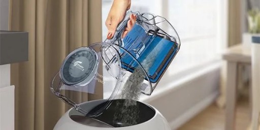 Łatwy do opróżnienia pojemnik na kurz został zaprojektowany z myślą o higienicznym opróżnianiu przy użyciu jednej ręki, co pozwala ograniczyć powstawanie chmury pyłu.