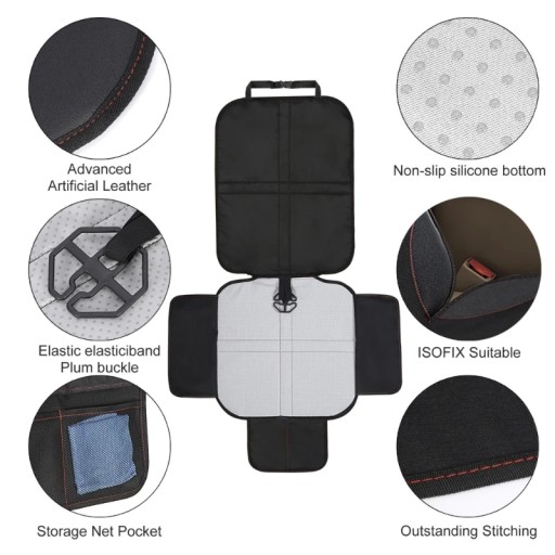 Ochraniacz na fotelik samochodowy może być używany nie tylko jako zabezpieczenie przed kopnięciem fotelika samochodowego dla dziecka, ale także jako pokrowiec na zwierzę, chroniący fotelik przed włosami lub odciskami łap. Pasuje dobrze do każdego tylnego lub przedniego siedzenia samochodu. Niezbędnik na rodzinnym wyjeździe.