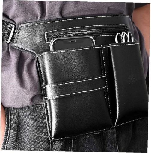 Profesjonalna kabura skórzana na przybory fryzjerskie, wykonana ze skóry ekologicznej w kolorze czarnym. Kabura posiada pięć przegródek na np. szczotki, grzebienie, nożyczki, jedną dużą kieszeń zapinaną zamkiem błyskawicznym oraz jedną przegrodę na np. maszynkę,telefon itp. Jest wygodna i posiada regulację obwodu w biodrach.