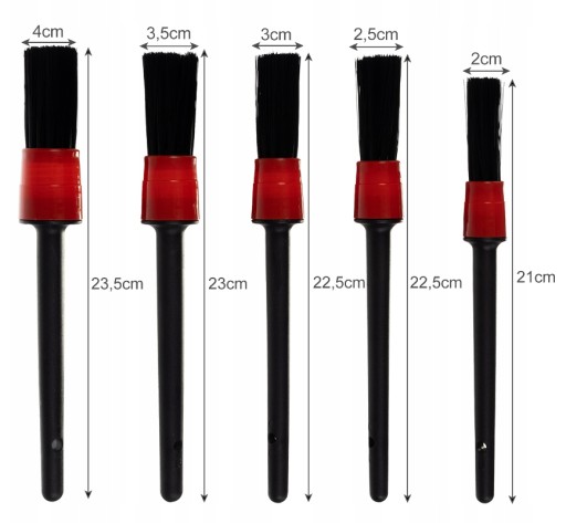 Zestaw zawiera 5 różnych pędzli o średnicy: 2cm, 2,5cm, 3cm, 3,5cm oraz 4cm.