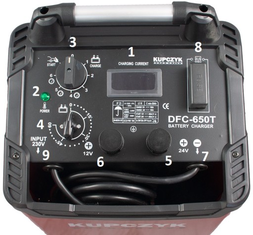 Prostownik do ładowania akumulatorów Kupczyk DFC-650T przeznaczony jest do ładowania akumulatorów kwasowych prądem o natężeniu 12V lub 24V. oraz do rozruchu samochodów osobowych, vanów, busów z silnikami benzynowymi oraz diesla, małych ciężarówek oraz lekkiego sprzętu budowlanego. Urządzenie wyposażone i intuicyjny panel sterowania z praktycznym elektronicznym wyświetlaczem. Na panelu znajdują się wygodne przełączniki: 12V/24V, przyciski wolnego i szybkiego ładowania oraz przycisk do rozruchu. Ponadto prostownik posiada bezpiecznik chroniący przed przeciążeniem. Dodatkowymi atutami urządzenia są koła ułatwiające transport prostownika oraz przednia kieszeń do schowania przewodów.