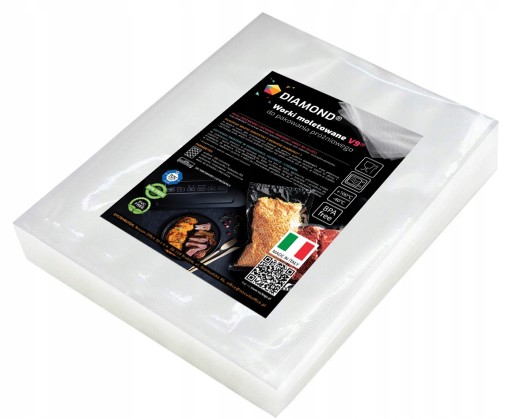 W ofercie worków i folii moletowanych DIAMOND® znajduje się ponad 20 standardowych rozmiarów i wzorów opakowań (worki i rękawy foliowe). Szeroka gama opakowań próżniowych pozwala na dopasowanie praktycznie do każdego produktu i każdego urządzenia do pakowania próżniowego.