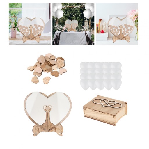 [Opakowanie]: zestaw ślubny księgi gości zawiera 1 ramkę w kształcie miłości, 20 balonów w kształcie serca, 2 czarne markery, 1 pudełko do przechowywania wiórów w kształcie miłości, 80 zrębków.