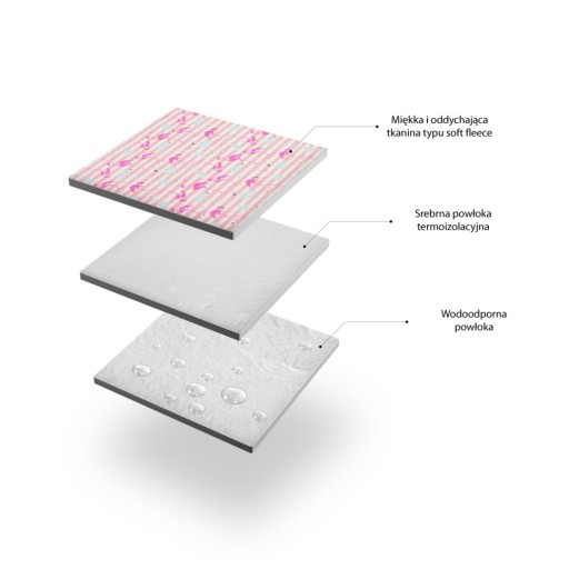 Wykonany z dwóch warstw materiału. Na wierzchu miękki, ciepły polar, zapewnia wygodę i komfort użytkowania. Od spodu natomiast wodoodporna powłoka aluminium, która umożliwia użycie koca na wilgotnym piasku czy trawie. Łącznie, oba te materiały stanowią doskonałą izolację termiczną.