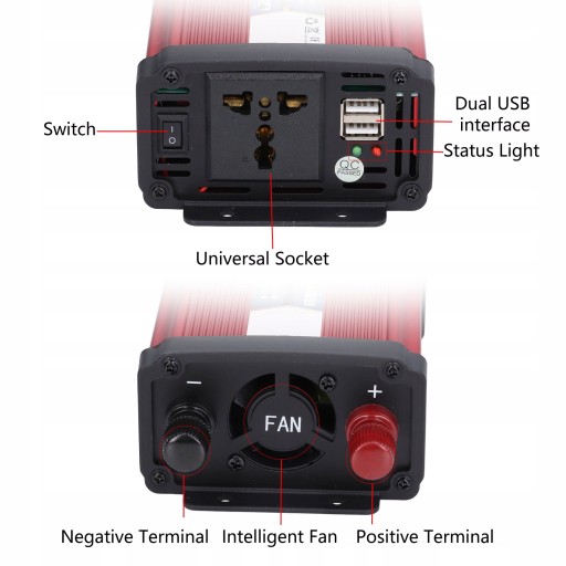 Specyfikacja: Typ artykułu: falownik samochodowy Materiał produktu: stop aluminium Zabezpieczenie przed wysokim napięciem: DC 15 V ± 1 V, DC 30 V ± 2 V Alarm niskiego napięcia: DC 10,5 V ± 0,3 V, DC 21 V ± 0,5 V Odcięcie niskiego napięcia: DC 10 V ± 0,3 V, DC 20,3 V ± 0,5 V Wyjście USB: prąd stały 5 V Kształt fali wyjściowej: Zmodyfikowana fala sinusoidalna Odwrotna ochrona połączenia: bezpiecznik Ochrona: przepięcie (odcięcie wysokiego napięcia jest rodzajem ochrony przed wysokim napięciem), przeciążenie, niskie napięcie, przetężenie, zwarcie, nadmierna temperatura
