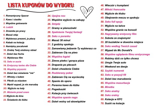 ✅ Różnorodność Tekstów: Nasz zestaw oferuje aż 70 tekstów do wyboru, co umożliwia indywidualne dopasowanie kuponów do Waszych preferencji i potrzeb. Każdy kupon zawiera zdrapkę, pod którą kryje się wybrana przyjemność, dzięki czemu każda wspólna chwila staje się jeszcze bardziej ekscytująca.