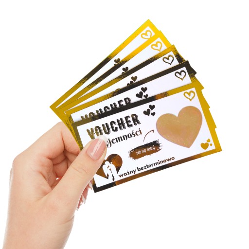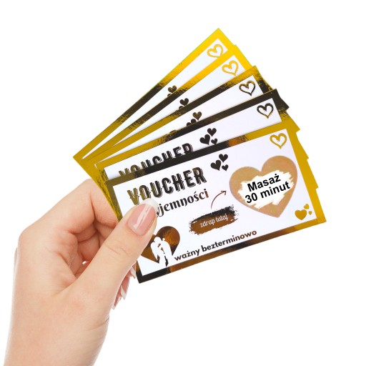Każdy kupon jest złocony folią metaliczną, co nadaje mu elegancki i luksusowy charakter. To wersja premium, która z pewnością wywoła uśmiech i wzbudzi zachwyt, dodając odrobinę blasku i magii do Waszych wspólnych chwil.