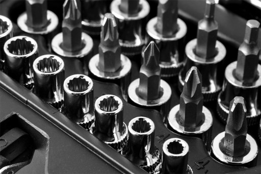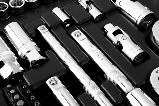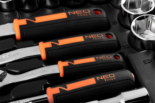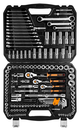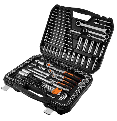 Klucze nasadowe 156 szt., 1/4", 3/8", 1/2", stal CrV, nasadki sześciokątne 1/2" 17 szt.: 10, 11, 12, 13, 14, 15, 16, 17, 18, 19, 20, 21, 22, 24, 27, 30, 32 mm, nasadki długie sześciokątne 1/2" 6 szt.: 10, 12, 13, 14, 17, 19 mm, grzecka 1/2", 90 zęby, przedłużki 1/2" 2 szt.: 125 mm i 250 mm, nasadki typu E 1/2" 3 szt.: E20, E22, E24, przegub uniwersalny 1/2", redukcja, 3/8"F X 1/2", nasadki dwunastokątne 3/8" 11 szt : 9, 10, 11, 12, 13, 14, 15, 16, 17, 18, 19 mm, nasadki długie sześciokątne 3/8" 6 szt.: 10, 11, 12, 13, 14, 15 mm, grzecka 3/8", 90 zęby, nasadki typu E 3/8" 6 szt.: E10, E11, E12, E14, E16, E18, przegub uniwersalny 3/8", przedłużki 3/8" 2 szt.: 75 mm i 150 mm, nasadki do świec 3/8" 2 szt.: 16 mm i 21 mm, bity na nasadkach 3/8" 20 szt.: PH1, PH2, PH3, TX30, TX40, TX45, TX50, TX55, HEX3, HEX4, HEX5, HEX6, HEX8, HEX10, PZ1, PZ2, PZ3, SL4, SL5.5, SL6.5, nasadki dwunastokątne 1/4" 13 szt.: 4, 4.5, 5, 5.5, 6, 7, 8, 9, 10, 11, 12, 13, 14 mm, nasadki długie sześciokątne 1/4" 6 szt.: 4, 5, 6, 7, 8, 9 mm, nasadki typu E 1/4" 5 szt.: E4, E5, E6, E7, E8, grzecka 1/4", 90 zęby; przegub uniwersalny 1/4", przedłużki 1/4" 2 szt.: 50 mm i 100 mm, pokrętło typu T 1/4", adapter do bitów 1/4", wkrętak do bitów 1 szt., bity 20 szt.: T10H, T15H, T20H, T25H, T27H, T30H, T40H, ST20, ST25, ST30, HEX3, HEX4, HEX5, HEX6, SL4, SL5.5, SL7, PH1, PH2, PH3, klucze sześciokątne 9 szt.: 1.5, 2, 2.5, 3, 4, 5, 6, 8, 10 mm, klucze płasko-oczkowe 12 szt.: 8, 9, 10, 11, 12, 13, 14, 15, 16, 17, 18, 19 mm, klucze oczkowe z grzecką 8x10 mm, 12x13 mm, 17x19 mm, 2