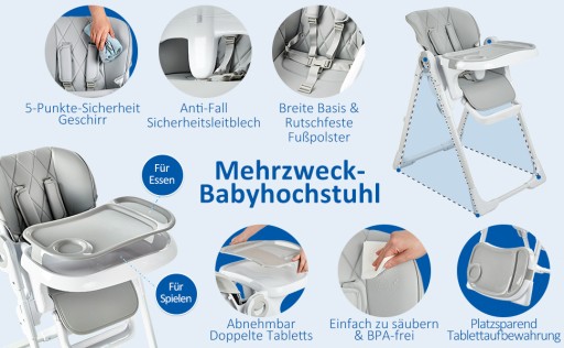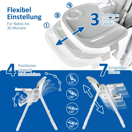 【Regulowana】 7-stopniowa regulacja wysokości, odpowiednia dla stołów o różnych wysokościach; 4-stopniowa regulacja oparcia, 3-stopniowa regulacja pedałów i podwójna taca, odpowiednia dla niemowląt/dzieci w wieku 3–36 miesięcy, o obciążeniu do 15-kg, bardzo nadaje się do karmienia, zabawy, jedzenia, relaksu i drzemki.