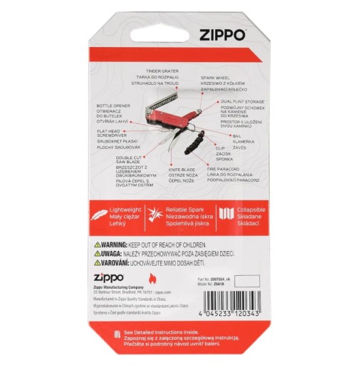 Subtelnych rozmiarów, poręczne narzędzie wielofunkcyjne, które zawsze warto mieć przy sobie. Doskonałe do prac poza domem. Fire Starting Multi-Tool jest przydatnym produktem do rozniecania ognia. Posiada wszystkie elementy potrzebne do rozpalenia i podtrzymania ognia. Zabudowana tarka do huby, noża i brzeszczotów piły rozdrobni hubę i przygotuje materiał rozpałkowy. Klasyczne koło Zippo oraz krzemienne krzesiwo z linką paracord są doskonałe do rozniecania ognia. Narzędzie skrywa w sobie także śrubokręt oraz otwieracz do butelek. Zestaw o niezwykłej wszechstronności idealnie sprawdzi się jako praktyczny prezent. Obudowa w intensywnym czerwonym wykończeniu kolorystycznym sygnowana dużym, firmowym logo - gwarancja oryginalności.