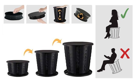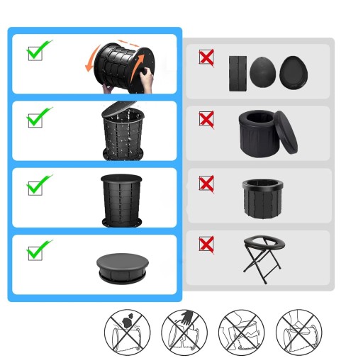 👍przenośna toaleta kempingowa może być łatwo przechowywana, bardzo mała i płaska, bardzo zajmująca mało miejsca. Daje swobodę przełączania pomiędzy różnymi trybami użytkowania, jako toaleta kempingowa, składany stołek, kosz do przechowywania, stolik boczny lub kosz na śmieci.