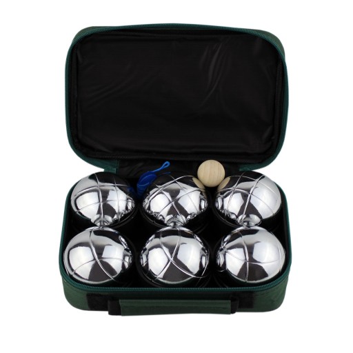 Każda para kul ma wygrawerowany inny wzór w celu łatwiejszego przypisania kul do poszczególnych graczy W mocnym, nylonowym pokrowcu z zamkiem i uchwytem, łatwo przechowasz i przetransportujesz cały zestaw W zestawie znajdziesz wszystko, czego potrzebujesz.