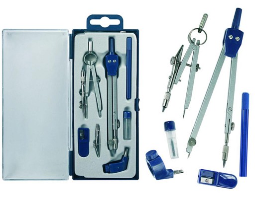 profesjonalny siedmioelementowy komplet geometryczny w plastikowym etui zestaw zawiera: składany cyrkiel z łamanym ramieniem, cyrkiel precyzyjny z końcówką do tuszu i grafitu, końcówkę do kreślenia tuszem z obsadką, temperówkę, końcówkę do rapidografów, zapasowy grafit