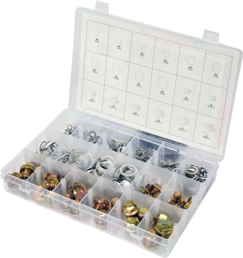 Zestaw 534 sztuk podkładek aluminiowych i korków spustowych do misek olejowych.