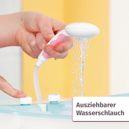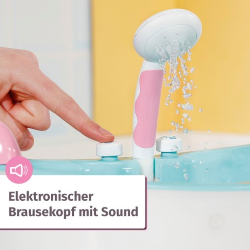 Zabawkowa wanna dla lalek Baby Born, z działającym prysznicem i efektami dźwiękowymi, zasilana 4 bateriami AA, w zestawie z bateriami.