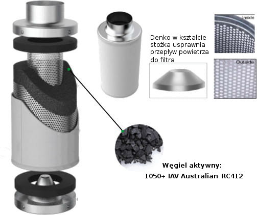Aerodynamiczne denko w kształcie stożka wpływa na równomierny przepływ powietrza oraz lepszą penetrację warstwy węgla aktywnego, tym samym zwiększając skuteczność filtracji oraz wydłużając żywotność filtra.