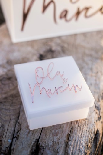 Ekskluzywne pudełko na obrączki wykonane z grubej plexi satynowej/mrożonej, z Waszymi imionami na górze pudełka.
