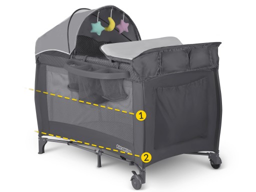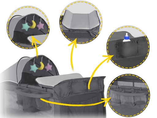 Do daszku można przymocować zabawki, a do ramy przewijak, który w każdej chwili można odczepić lub opuścić na bok, korzystając z niego tylko w razie potrzeby. Jest też organizer i kieszonki na rzeczy potrzebne do pielęgnacji maluszka.