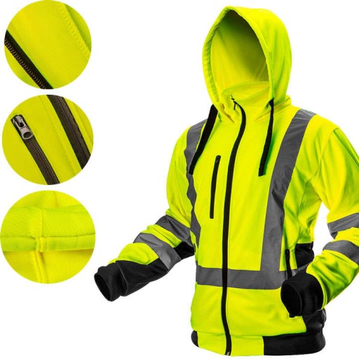 Bluza robocza ostrzegawcza, żółta, rozmiar XXL, o intensywnej widzialności, klasa 3 wg normy EN ISO 20471, 100% poliester, 240 g/m2, wewnętrzna polarowa, dwuwarstwowy kaptur i kołnierz, rękawy i pas ze ściągaczem, 3 kieszenie zapinane na suwak, ciemne wstawki w miejscach narażonych na ubrudzenie, certyfikat CE, EN ISO 13688:2013