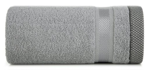 Jednobarwny ręcznik z miękkiej i chłonnej tkaniny bawełnianej o splocie frotte zdobiony kolorową bordiurą w stylu fastrygi. Łatwy w praniu, nie farbuje. szerokość: 100 cm, długość: 150 cm, kolor: jasnoszary, Gramatura: 500 GSM, Skład: 100% bawełna; częsc ozdobna: 75% poliester, 25% wiskoza