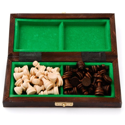 Składana drewniana plansza do gry w szachy. Po złożeniu, można w niej przechować wszystkie figury do następnej rozgrywki.