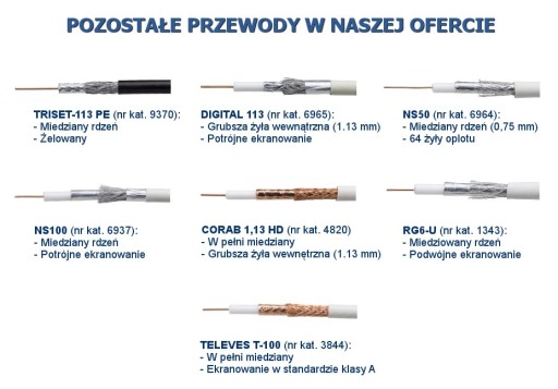 TRISET-113PE jest nowoczesnym kablem o impedancji 75 Ω charakteryzującym się bardzo dobrymi parametrami elektrycznymi i mechanicznymi Dla ułatwienia pracy, na kablu co 1 m został nadrukowany znacznik długości