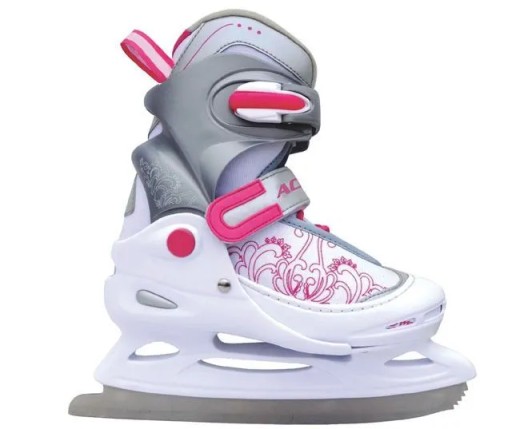 Łyżwy dziewczęce ACTION, obejmują 4 regulowane rozmiary w jednej rolce. Rolki mają wodoodporną powłokę (impregnację), która zapobiega przenikaniu wilgoci do buta, a jednocześnie zapobiega zimnu stopy Niemniej jednak zalecamy okresowe impregnowanie rolek powszechnie dostępnymi środkami impregnującymi Następnie but można regulować w razie potrzeby. Procedura regulacji łyżwy: Obróć dźwignię na spodzie łyżwy o 90 stopni, prostopadle do noża Następnie but można regulować w razie potrzeby Następnie dźwignię należy zablokować w pierwotnym położeniu, tak aby była równoległa do łyżwy (Dźwignia może być obrócona w obie strony, należy przestrzegać zasady, że musi ona być skierowana równolegle do noża).