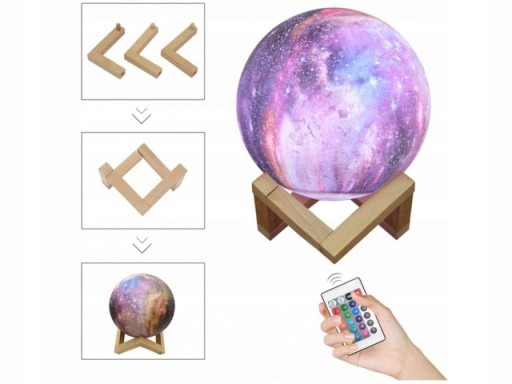 Lampka nocna w efektownym kształcie gwiazdy. Wprowadzi magiczny nastrój w pomieszczeniu np. sypialni, pokoju dziecięcym czy w salonie. Wykonana została w technice 3D, dzięki temu bardzo realistycznie odwzorowuje gwiazdę. Lampa po włączeniu daje nastrojowe światło w dowolnie wybranym kolorze. Dzięki dołączonemu do zestawu pilotowi możemy wybrać dowolną opcję świecenia naszej kuli.