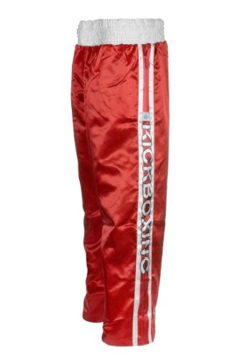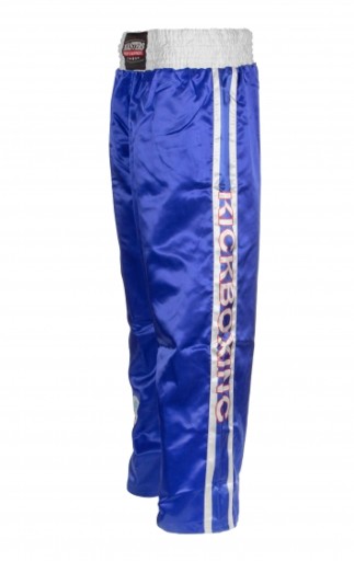 Długie spodnie do kickboxingu. Doskonale sprawdzą się podczas najważniejszych zawodów czy treningów. Szeroka guma w wyróżniającym się kolorze i wewnętrzne sznurki utrzymują spodnie we właściwym miejscu. Bardzo duży klin pozwala na większą swobodę ruchu i wygodę przy noszeniu suspensora. Naszywka z logo WAKO z boku nogawki - posiadają atest do startu w zawodach kickboxingu.